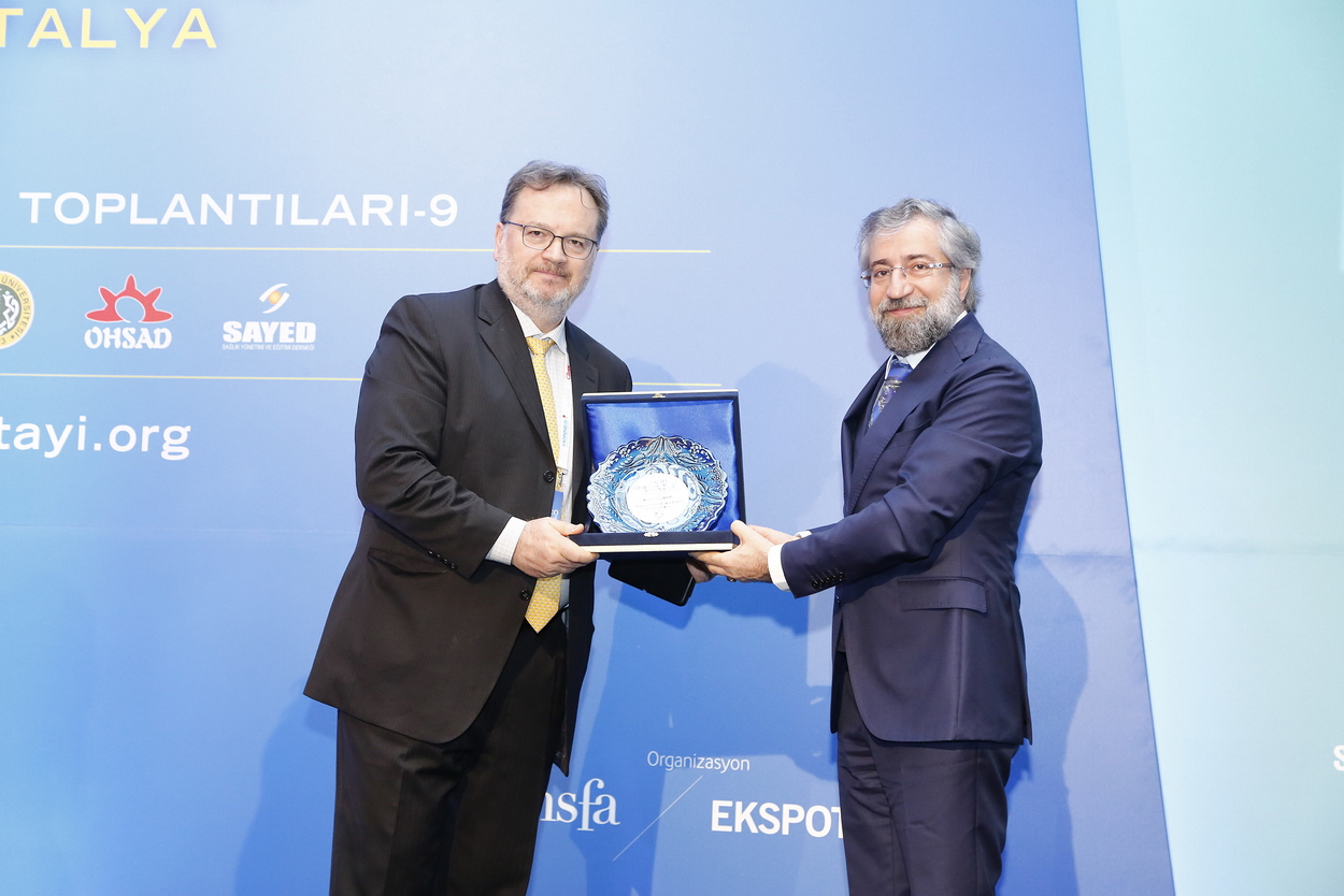 Dünya Bankası Avrupa ve Orta Asya Sağlık Beslenme ve Nüfus Küresel Uygulama Yöneticisi Dr. Enis Barış'a konuşmasının ardından plaketini OHSAD Yönetim Kurulu Başkan Yardımcısı Dr. Ahmet Şah Kolan verdi.